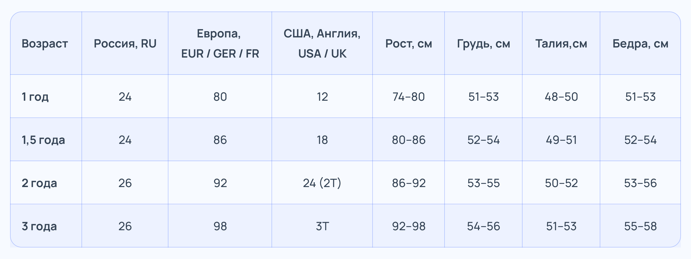 Российские и зарубежные размеры детской одежды для мальчиков и девочек 1–3 лет: